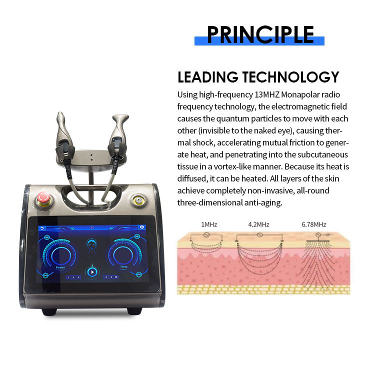 During operation, a high-frequency electromagnetic field drives the quantum particles in the skin tissue to move and rub against each other, generating a gentle thermal impact. This accelerates cell metabolism and blood circulation, stimulating fibroblasts to secrete collagen and elastin, thereby promoting skin structure reconstruction and achieving comprehensive anti-aging effects such as tightening, lifting, and wrinkle reduction.